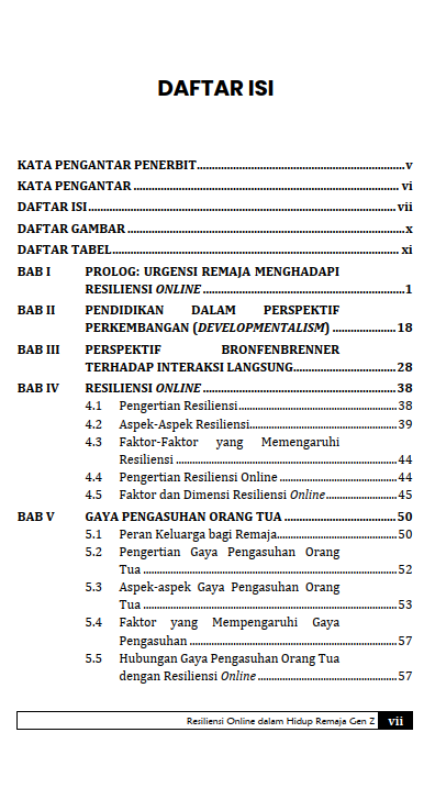 Buku ini menyajikan bagaimana gaya pengasuhan orang tua, gaya komunikasi guru, dan dukungan sosial teman sebaya berpengaruh terhadap resiliensi online remaja. Buku ini membantu mengembangkan konsep tentang pendidikan dan psikologi resiliensi online, serta bermanfaat bagi para pemangku kepentingan, yaitu orang tua, guru, pemerintah, dan lembaga pemerhati anak, karena perspektif yang ditawarkannya dapat digunakan dalam pembuatan kebijakan yang berkaitan dengan perlindungan anak.