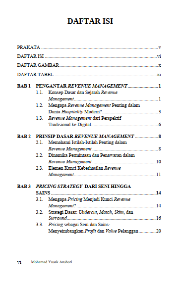 Dengan kombinasi yang seimbang antara teori, contoh kasus nyata, serta penerapan teknologi digital terbaru seperti Artificial Intelligence (AI), Big Data Analytics, dan Machine Learning, pembaca diajak untuk memahami bagaimana Revenue Management mampu meningkatkan profitabilitas serta daya saing. Buku ini tidak hanya ditujukan bagi kalangan akademisi atau mahasiswa perhotelan, tetapi juga bagi para praktisi, manajer, dan pemilik bisnis yang ingin secara praktis mengelola kapasitas, harga, dan permintaan pasar secara lebih efektif.