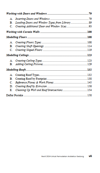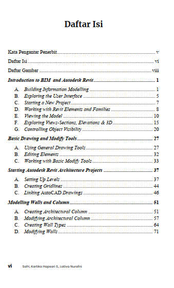 Building Information Modeling (BIM) adalah penggunaan bersama representasi digital dari aset yang dibangun untuk memfasilitasi proses desain, konstruksi dan operasi untuk membentuk dasar yang andal untuk pengambilan keputusan. BIM merupakan suatu metodologi digital yang memanfaatkan data ke dalam sebuah model. Dengan memanfaatkan data digital sebagaimana kondisi fisik sebenarnya, proyek dapat mengidentifikasi risiko dengan optimal. BIM dan Manajemen data yang terlibat di dalamnya adalah evolusi terhadap desain, pembangunan (construct), sehingga pengoperasian proyek menjadi lebih handal, lebih cepat dan lebih efisien. Revit adalah software untuk membuat desain 3D yang mendukung program BIM (Building Information Modeling). Software ini merupakan salah satu produk dari Autodesk. Revit merupakan aplikasi untuk pengerjaan BIM yang dapat melakukan permodelan 3D. Buku berjudul Revit 2024 Untuk Pemodelan Arsitektur Gedung ini membahas mengenai BIM dan Autodesk Revit sebagai cara atau pembaharuan dalam menangani sebuah bangunan atau gedung. BIM memiliki fungsi sebagai sarana untuk membuat perencanaan, perancangan, pelaksanaan pembangunan, serta pemeliharaan bangunan tersebut beserta infrastrukturnya bagi semua pihak yang terkait di dalam proyek seperti konsultan, owner, dan kontraktor.