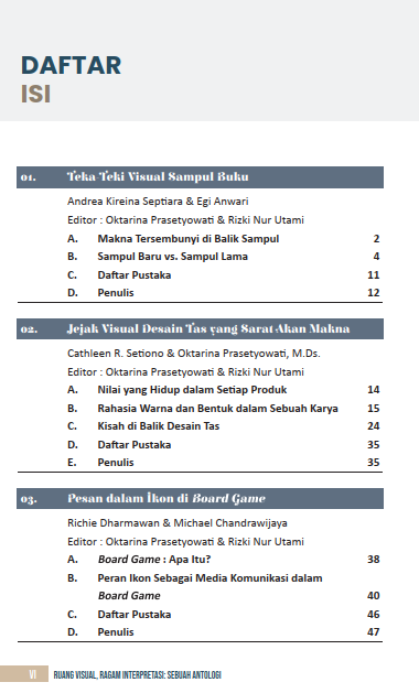 Kita hidup di tengah banyaknya visual yang ternyata menyimpan segudang cerita dan pengaruh yang tidak terduga. Buku ini hadir untuk mengupas berbagai aspek menarik tentang bagaimana elemen visual bekerja, mulai dari teka-teki sampul buku, makna dari sebuah tas, sampai pesan tersembunyi dalam ikon board game. Pembaca juga akan diajak menyelami bagaimana konten digital mampu memengaruhi pikiran audiens, interaksi pengguna media sosial, cara kerja hook, sampai daya tarik kemasan produk. Lebih dalam lagi, buku ini akan menyoroti peran visual, pentingnya penegasan karakter, dan membandingkan visual di media sosial dengan dunia nyata. Setelah membacanya, kita akan menyadari kekuatan dan bahasa universal dunia visual yang selama ini mungkin terlewatkan.