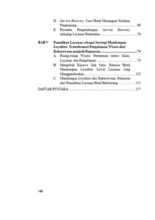 Buku ini mengungkap pentingnya Service Recovery (pemulihan layanan) sebagai jantung operasi hotel berbintang. Ini bukan sekadar tindakan reaktif untuk meminta maaf, melainkan strategi proaktif yang mengubah kekecewaan tamu menjadi kepuasan mendalam. Melalui buku ini, Anda akan memahami bagaimana empati, kecepatan tanggapan, dan keadilan dalam menangani komplain mampu memperkuat citra hotel.