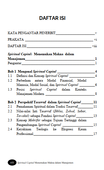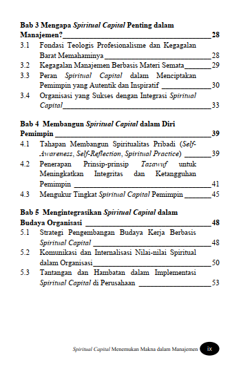 Buku Spiritual Capital: Menemukan Makna dalam Manajemen menawarkan perspektif berbeda. Dengan mengintegrasikan prinsip-prinsip tasawuf seperti ikhlas, sabar, zuhud, dan tawakal, buku ini menghadirkan jawaban atas kegelisahan dunia manajemen modern. Spiritual capital bukan hanya konsep, tetapi kekuatan nyata yang mampu menghidupkan kembali ruh kepemimpinan, budaya organisasi, dan kehidupan profesional.