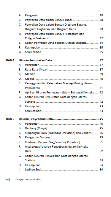 Buku Statistika Deskriptif Berbasis Literasi Statistis: Teori dan Aplikasi di Bidang Pendidikan ini menyajikan informasi meliputi statistika dan literasi statistis, pengumpulan data, penyajian data, ukuran pemusatan data, ukuran penyebaran data, pengukuran posisi data, distribusi frekuensi dan pengukuran bentuk distribusi, statistik deskriptif untuk data kualitatif, analisis data dengan software statistik, serta contoh aplikasi statistika deskriptif. Buku ini dilengkapi dengan latihan soal dan kunci jawaban sebagai sarana untuk menguji pemahaman pembaca terhadap materi. Semoga buku ini bermanfaat dalam memperkaya khazanah keilmuan di bidang pendidikan. Selamat membaca!