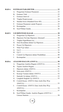 Buku Statistika Inferensial Berbasis Literasi Statistis: Teori dan Aplikasi dalam Bidang Pendidikan ini memuat uraian mengenai statistika inferensial dalam bidang pendidikan serta penerapannya. Statistika inferensial memungkinkan kita membuat kesimpulan tentang populasi berdasarkan data yang dikumpulkan dari sampel. Dalam pendidikan, hal ini sangat penting ketika guru ingin mengetahui apakah metode pembelajaran baru efektif, atau ketika kepala sekolah ingin mengevaluasi program intervensi yang dijalankan di sekolah. Sayangnya, banyak praktisi pendidikan yang belum memiliki bekal yang cukup dalam memahami dasar-dasar statistika inferensial dan aplikasinya. Di sinilah literasi statistis menjadi jembatan antara pengetahuan statistik dan pemanfaatan data secara bijak.