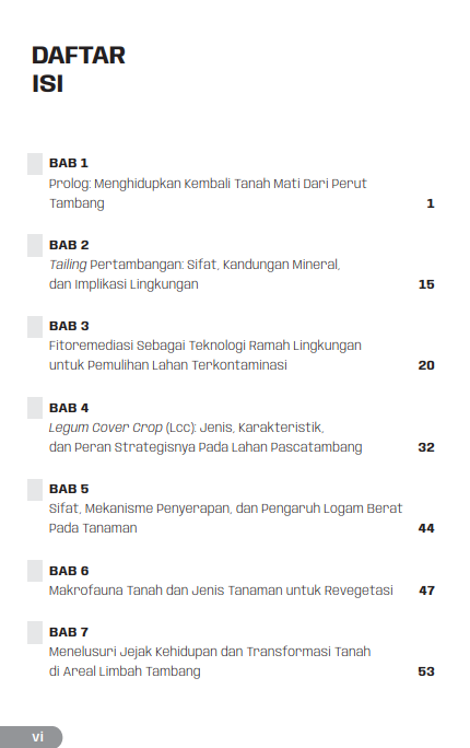 Pembaca akan diajak menyaksikan pertumbuhan tanaman di tempat yang seolah mustahil untuk ditumbuhi, mengamati perilaku logam berat di akar dan daun, serta menelusuri jejak kehidupan mikro dan makro yang membentuk ekosistem baru. Buku ini adalah narasi tentang ketekunan, strategi, dan harmoni alam yang membangkitkan harapan, sekaligus meninggalkan rasa ingin tahu: bisakah tanah yang rusak benar-benar pulih sepenuhnya?