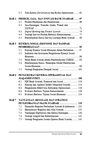 Selanjutnya, buku ini membahas struktur organisasi dan tata kelola yang diperlukan untuk menjaga integritas dan keberlanjutan operasional bank syariah. Pembahasan dilanjutkan dengan pengembangan produk, jasa, serta inovasi yang mampu memenuhi kebutuhan nasabah sekaligus tetap memegang teguh prinsip syariah. Tidak hanya fokus pada aspek keuangan, buku ini juga menekankan kinerja sosial-ekonomi bank syariah serta peranannya dalam pemberdayaan masyarakat. Selain itu, buku ini memberikan panduan pengukuran kinerja melalui strategi Maqashid Index, sehingga keberhasilan bank tidak hanya dilihat dari aspek profitabilitas, tetapi juga dari pencapaian tujuan syariah. Dalam menghadapi tantangan global, perubahan regulasi, dan perkembangan teknologi, buku ini menawarkan strategi pengembangan yang relevan dan aplikatif. Kasus-kasus yang disajikan memberikan gambaran nyata tentang implementasi strategi di lapangan, sementara pembahasan mengenai manajemen operasi, strategi bisnis, serta pengelolaan sumber daya insani dan kepemimpinan syariah memperkuat pemahaman pembaca mengenai pengelolaan bank syariah secara holistik. Dengan pemahaman teoritis dan praktis, buku ini menjadi referensi penting bagi akademisi, praktisi, regulator, dan mahasiswa yang ingin memahami serta mengembangkan perbankan syariah yang berdaya saing dan berorientasi pada kemaslahatan umat.
