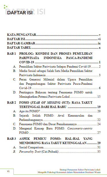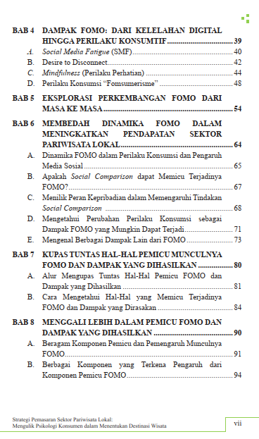 Buku ini hadir untuk mengungkap seberapa besar pengaruh FOMO dalam mendorong individu untuk mengikuti tren wisata yang sedang populer di media sosial. Buku ini mendalami fenomena FOMO dari berbagai komponen pemicu berupa social comparison dan personality trait serta dampak yang dihasilkan, seperti perubahan perilaku konsumsi, social media fatigue, desire to disconnect, dan mindfulness. Dengan memahami faktor psikologis konsumen dalam menentukan destinasi wisata, buku ini memberikan wawasan yang berguna bagi pemasar sektor pariwisata untuk merancang strategi yang lebih efektif dalam menarik perhatian wisatawan, baik wisatawan mancanegara maupun nusantara, agar mengunjungi pariwisata lokal.