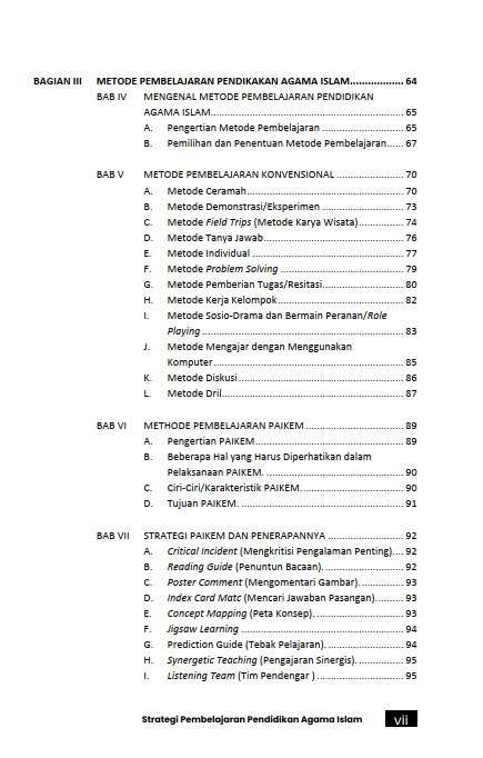 Salah satu fokus utama buku ini adalah pada berbagai strategi dan metode pembelajaran yang dapat diterapkan dalam konteks PAI. Dengan mengacu pada perkembangan terkini dalam bidang pendidikan, buku ini menyajikan beragam alternatif metode, mulai dari pembahasan tradisional hingga pembahasan kontemporer yang lebih inovatif. Pembahasan mendalam mengenai metode pembelajaran PAIKEM (Peserta Aktif, Inovatif, Kreatif, Efektif, Menyenangkan) menjadi salah satu sorotan penting dalam publikasi ini.
