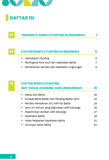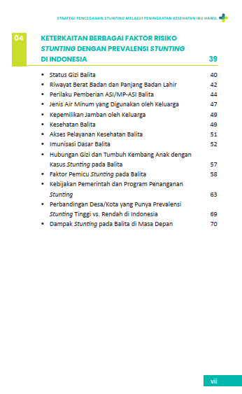 Buku ini mengupas berbagai faktor penyebab terjadinya stunting pada balita di Indonesia yang digunakan sebagai upaya pencegahan dan penurunan angka stunting. Pemerintah menargetkan untuk menurunkan angka stunting nasional menjadi 14% pada tahun 2024. Pemerintah menekankan pentingnya kerja sama lintas sektor dan program pendidikan kesehatan, khususnya yang berfokus pada gerakan “ibu hamil sehat” untuk mengatasi penyebab mendasar dari stunting.