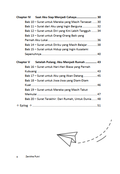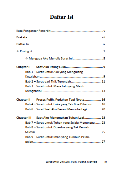 Buku Surat untuk Diri Luka, Pulih, Pulang, Menyala lahir dari kejujuran penulis terhadap luka yang belum sepenuhnya sembuh. Kisah ini bukan kisah tentang seseorang yang telah selesai berjuang, melainkan tentang proses yang penuh ragu, tangis, dan keberanian untuk tetap berjalan meski rapuh. Melalui tulisan-tulisan yang lembut namun tajam, penulis mengajak pembaca untuk menatap luka dengan mata yang jujur—bukan untuk meratapinya, tetapi untuk memahaminya sebagai bagian dari perjalanan pulang menuju diri yang utuh.