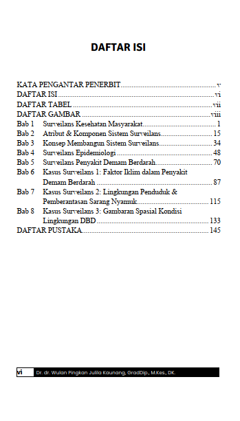 Buku ini menjelaskan secara komprehensif tentang surveilans kesehatan masyarakat dengan fokus pada penyakit menular seperti demam berdarah dengue (DBD). Surveilans mencakup pengumpulan, analisis, dan interpretasi data kesehatan untuk merencanakan, melaksanakan, dan mengevaluasi kebijakan kesehatan. buku ini menguraikan fungsi surveilans mengidentifikasi pola penyebaran, efektivitas intervensi, dan kebutuhan sumber daya yang optimal, serta memberikan kewaspadaan dini terhadap masalah kesehatan, khususnya kasus DBD. Diharapkan buku ini dapat menambah pengetahuan dan diimplementasikan dalam kehidupan sehari-hari agar terhindar dari penyakit demam berdarah dengue (DBD). Selamat membaca!