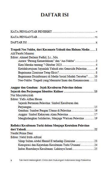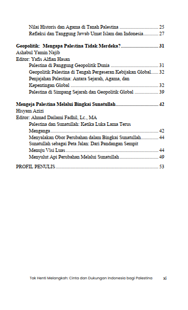 Buku berjudul Langkah Tak Surut: Suara Indonesia untuk Palestina ini menyajikan ulasan mengenai tragedi Neo Nakba dilihat dari kacamata Yahudi dan haluan media, jejak kesuburan Palestina dalam sejarah dan perjuangan identitas kuliner, refleksi Kesultanan Turki dalam menjaga keutuhan Palestina dari Yahudi, tinjauan geopolitik mengenai perjuangan kemerdekaan Palestina, hingga menilik Palestina melalui bingkai sunatullah. Semoga buku ini bermanfaat sebagai bahan bacaan yang memperkaya wawasan keilmuan pembaca. Selamat membaca!