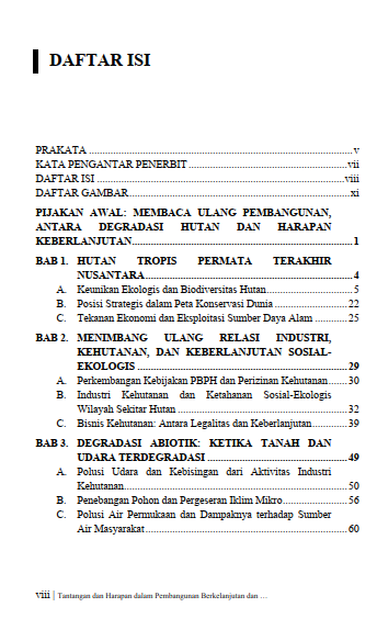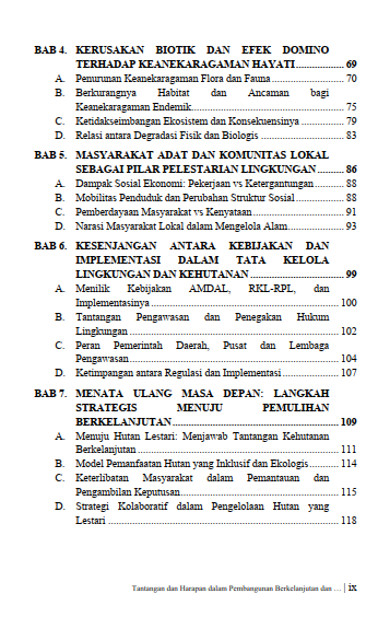 Buku ini mengupas tuntas masalah ironi ekologis dan sosial yang muncul dari inisiatif pembangunan di wilayah yang terkenal akan keanekaragaman hayatinya. Pembangunan telah memberikan tekanan yang sangat besar pada hutan, yang menyebabkan degradasi lingkungan, lemahnya pengawasan, dan terbatasnya keterlibatan masyarakat lokal. Dokumen formal seperti Analisis Mengenai Dampak Lingkungan (AMDAL), Rencana Pengelolaan Lingkungan (RKL), dan Rencana Pemantauan Lingkungan (RPL) memang secara administratif telah disusun, akan tetapi sering kali belum memiliki implementasi yang substantif di lapangan.