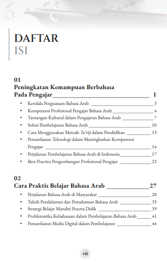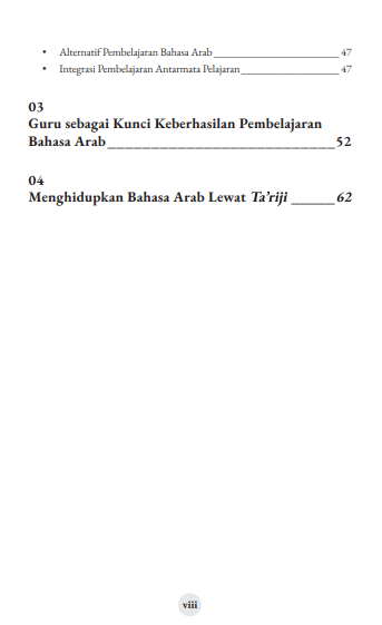Disampaikan dengan bahasa yang ringan namun sistematis, buku ini menjadi panduan praktis bagi para pendidik dan pemerhati pendidikan Islam yang ingin mengembangkan pembelajaran bahasa Arab secara menyeluruh dan berkesinambungan. Metode Ta’riji ditawarkan sebagai alternatif yang menjanjikan dalam menjawab tantangan pembelajaran bahasa Arab di berbagai jenjang pendidikan nonformal.