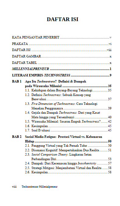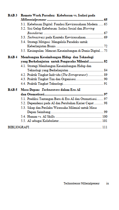Berbasis pengalaman praktis, buku ini mengungkapkan bagaimana technostress tidak hanya berdampak pada individu, tetapi juga pada organisasi secara keseluruhan. Selain itu, buku ini menawarkan strategi konkret dalam mengelola stres digital, mulai dari cara-cara mengatur batasan waktu penggunaan teknologi, mengelola tim secara efektif di dunia digital, hingga bagaimana millennialpreneur dapat tetap menjaga inovasi tanpa kehilangan keseimbangan mental. Pembaca juga diajak untuk mengenali pentingnya keterampilan hibrida yang menggabungkan kecakapan teknologi dengan kemampuan komunikasi dan kepemimpinan yang kuat.