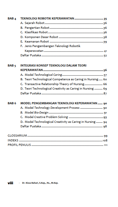 Saat ini, di era Revolusi Industri 4.0 perkembangan teknologi canggih di bidang pelayanan kesehatan berkembang sangat pesat. Rutinitas praktik keperawatan terutama di unit-unit perawatan kritis menjadi sangat bergantung terhadap penggunaan teknologi canggih. Hal tersebut dikarenakan kemudahan, efisiensi, dan efektivitas yang dirasakan dalam melaksanakan asuhan keperawatan. Namun sayangnya, sebagian besar teknologi yang telah digunakan dalam praktik keperawatan belum banyak yang diciptakan atau didesain oleh perawat. Teknologi-teknologi keperawatan terutama berupa instrumen keperawatan belum banyak dikaji secara adekuat. Sebagai akibatnya perkembangan teknologi keperawatan masih tertinggal jauh dari teknologi kesehatan lainnya. Sebagian besar perawat masih hanya sebagai pengguna atau operator teknologi kesehatan tersebut. Banyak teknologi yang digunakan dalam praktik keperawatan ‘meminjam’ dari profesi kesehatan lain. Oleh karena itu, untuk menghadapi masalah yang lebih kompleks dalam praktik keperawatan, maka perawat perlu didorong mengembangkan kreativitasnya untuk melakukan inovasi-inovasi teknologi keperawatan sebagai wujud ekspresi caring perawat. Tantangan besar di era ini adalah perawat harus juga dapat menjadi seorang designer untuk dapat menciptakan teknologinya sendiri. Kemampuan ini sangat penting, karena melalui ide-ide yang inovatif, perawat dapat meningkatkan kualitas asuhan keperawatan pada pasien. Untuk menjawab tantangan tersebut penulis mencoba menulis sebuah buku yang berisi beberapa pokok bahasan yang relevan dengan teknologi keperawatan yang meliputi: 1) konsep teknologi, 2) teknologi keperawatan, 3) teknologi informasi keperawatan, 4) teknologi robotik keperawatan, 5) integrasi konsep teknologi dalam teori keperawatan, dan 6) model pengembangan teknologi. Harapannya pokok-pokok bahasan tersebut dapat menginspirasi dan memberikan panduan secara teoretis bagi dosen, praktisi, mahasiswa keperawatan dalam pengembangan teknologi keperawatan ke depan.