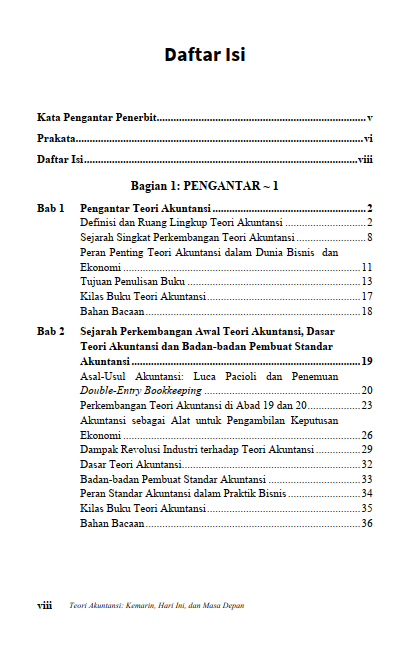 Buku “Teori Akuntansi: Kemarin, Hari Ini, dan Masa Depan” ini memberikan pandangan komprehensif mengenai teori akuntansi, menghubungkan sejarahnya, perkembangan masa kini, dan proyeksi masa depan yang penuh tantangan dan inovasi. Buku ini diharapkan dapat menjadi referensi yang berguna bagi akademisi, praktisi, dan mahasiswa yang ingin memahami perkembangan dan peran teori akuntansi dalam dunia bisnis yang dinamis.