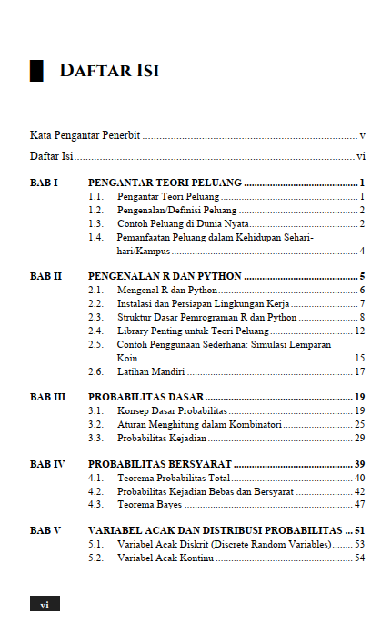 Penguasaan R dan Python memberikan keuntungan besar bagi pembaca dalam menghadapi tantangan analisis data modern, karena kedua bahasa ini memiliki ekosistem yang kuat dan banyak digunakan dalam dunia akademis maupun industri. Dengan memadukan teori, praktik, dan teknologi, buku ini menjadi sumber pengetahuan yang komprehensif dan relevan. Diharapkan, pembaca tidak hanya memahami teori peluang secara mendalam, tetapi juga mampu mengimplementasikannya secara efektif untuk menyelesaikan berbagai permasalahan nyata dalam dunia data dan pengambilan keputusan.