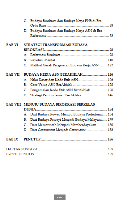 Berdasarkan perspektif budaya organisasi, budaya birokrasi Indonesia berisi nilai-nilai dan norma-norma yang sudah terinternalisasi melalui proses yang panjang. Proses itu terbentuk oleh pengaruh lingkungan budaya patronase feodal sejak zaman kerajaan-kerajaan di Nusantara hingga hadirnya pemerintahan kolonial di Indonesia. Budaya ini menjadi sangat kuat, rigid, dan dominan dalam birokrasi dan budaya kerja ASN hingga saat ini. Buku TRANSFORMASI BUDAYA ORGANISASI BIROKRASI DAN BUDAYA KERJA ASN – Dari Budaya Power Menuju Budaya Profesional, dari Budaya Priyayi Menuju Budaya Melayani ini mengulas bagaimana hubungan patron dan klien dalam birokrasi Indonesia di era kerajaan, era penjajahan, era orde lama, era orde baru, dan era reformasi. Selanjutnya bagian akhir buku ini membahas tentang mengapa harus dilakukan transformasi budaya birokrasi dan budaya kerja ASN, budaya baru yang ingin dibentuk, serta strategi dalam mengubah budaya tersebut.