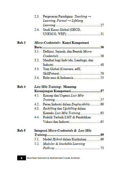 Buku ini hadir sebagai undangan untuk melihat masa depan secara lebih jernih: bagaimana micro-credentials, Last Mile Training (LMT), dan Outcome-Based Education (OBE) dapat membentuk ekosistem pendidikan yang adaptif, relevan, dan berdaya saing global.