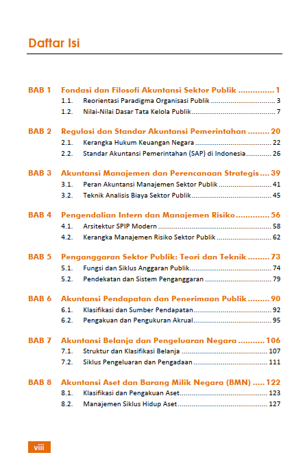 Buku ini memandu pembaca menelusuri berbagai aspek penting dalam pengelolaan keuangan publik, mulai dari dasar-dasar tata kelola, perencanaan anggaran, pengelolaan pendapatan dan belanja negara, hingga pengelolaan aset dan kewajiban pemerintah. Setiap pembahasan memperlihatkan bagaimana pengelolaan keuangan tidak hanya soal pencatatan angka, tetapi juga tentang memastikan setiap sumber daya negara digunakan untuk sebesar-besarnya kepentingan masyarakat.