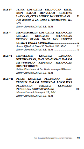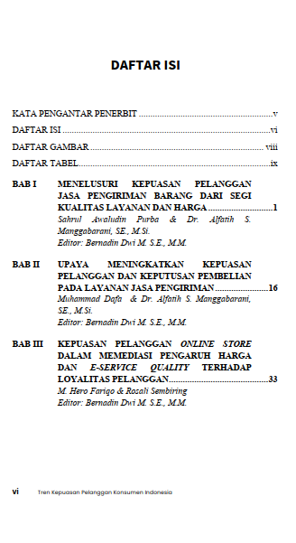 Buku Tren Kepuasan Pelanggan Konsumen Indonesia ini tersusun atas tujuh bab, dengan ulasan materi meliputi kepuasan pelanggan jasa pengiriman barang dari segi kualitas layanan dan harga; upaya meningkatkan kepuasan pelanggan dan keputusan pembelian pada layanan jasa pengiriman; kepuasan pelanggan online store dalam memediasi pengaruh harga dan e-service quality terhadap loyalitas pelanggan; jejak loyalitas pelanggan ritel kopi dalam menyulam kualitas layanan, citra merek, dan kepuasan; menumbuhkan loyalitas pelanggan melalui kepuasan pelanggan dengan brand image dan service quality pada e-commerce; menyelami kualitas layanan, kepercayaan, dan keamanan dalam mewujudkan kepuasan pelanggan dompet digital; serta peran kualitas pelayanan dan produk dalam mencapai loyalitas pelanggan melalui kepuasan pengguna grocery online. Buku ini cocok untuk dibaca baik kalangan akademisi, ekonom, maupun pembaca umum yang ingin memperkaya wawasan di bidang analisis pemasaran, khususnya perilaku konsumen. Selamat membaca!