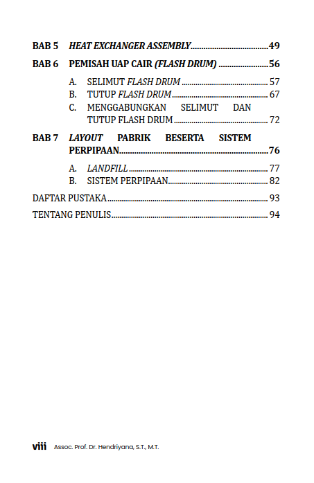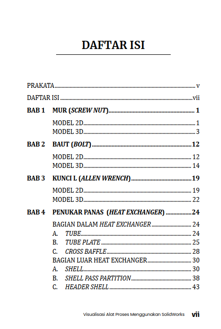 Buku VISUALISASI ALAT PROSES MENGGUNAKAN SOLIDWORKS menyajikan materi untuk penguasaan pemodelan 3D dalam lingkup rekayasa proses. Fokus utama buku ini adalah memberikan kompetensi aplikatif perangkat lunak SolidWorks, mulai dari perancangan komponen standar hingga visualisasi sistem proses industri secara terintegrasi. Materi pembelajaran disusun secara bertahap untuk membangun pemahaman yang solid. Pembahasan diawali dengan pemodelan komponen fundamental seperti mur dan baut, sebelum beralih ke studi kasus perancangan alat proses yang lebih kompleks. Pembaca akan mempelajari perancangan detail sebuah Penukar Panas (Heat Exchanger)—mencakup tube, tube plate, baffle, hingga perakitan shell—serta visualisasi Pemisah Uap Cair (Flash Drum). Sebagai puncak aplikasi, buku ini membimbing perancangan layout pabrik yang dilengkapi sistem perpipaan. Tujuannya adalah membekali pembaca dengan kemampuan untuk menciptakan visualisasi rekayasa yang komprehensif dan fungsional, dari komponen tunggal hingga skala pabrik.