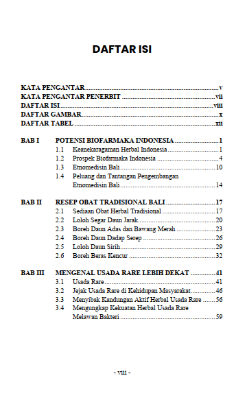 Tumbuhan obat atau biofarmaka didefinisikan sebagai jenis tanaman yang sebagian, seluruh tanaman dan atau eksudat tanaman tersebut digunakan sebagai obat, bahan atau ramuan obat-obatan. Pemanfaatan tumbuhan obat telah lama diwariskan dari generasi ke generasi dan perlu dilestarikan secara turun-temurun. Usada Rare merupakan salah satu jenis metode pengobatan tradisional yang merupakan bagian dari kitab pengobatan tradisional Bali yang dikenal dengan Lontar Usada. Usada Rare menekankan pencegahan dan penyakit pada “rare”atau istilah untuk menyebut anak-anak di Bali. Buku ini disusun penulis untuk membantu upaya pelestarian warisan pengobatan tradisional, khususnya Usada Rare. Tulisan dalam buku Warisan Leluhur Bali: Usada Rare sebagai Herbal Alami ini diharapkan dapat memperkaya dan melengkapi pemahaman tentang Usada Rare, khususnya jenis-jenis tanaman obat serta potensi bioaktivitas herbal Usada Rare. Herbal Usada Rare ini dikembangkan menjadi kandidat obat bahan alam sebagai antibakteri Salmonella khususnya Salmonella enterica serovar Typhimurium. Buku ini juga dilengkapi dengan beberapa resep herbal tradisional di Bali seperti sediaan loloh ataupun boreh untuk mengenalkan dan memperkaya bahasan.