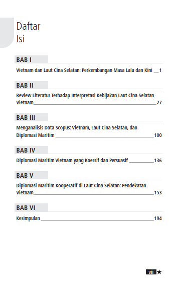 Buku WAWASAN GLOBAL DIPLOMASI MARITIM VIETNAM DI LAUT CINA SELATAN menyajikan wawasan komprehensif yang membedah secara mendalam strategi Hanoi yang cerdik, dari tinjauan sejarah konflik hingga implementasi kebijakan modern. Buku ini unik karena menyajikan kekokohan akademis melalui publikasi Scopus yang memetakan tren diplomasi, sekaligus mengupas tiga pilar taktis Vietnam: diplomasi koersif, persuasif, dan kooperatif.