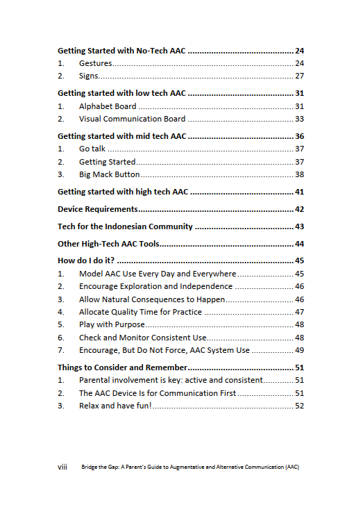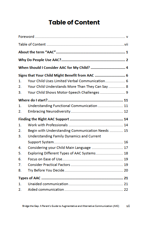 Table contens Book of Bridge the Gap A Parent’s Guide to Augmentative and Alternative Communication (AAC):