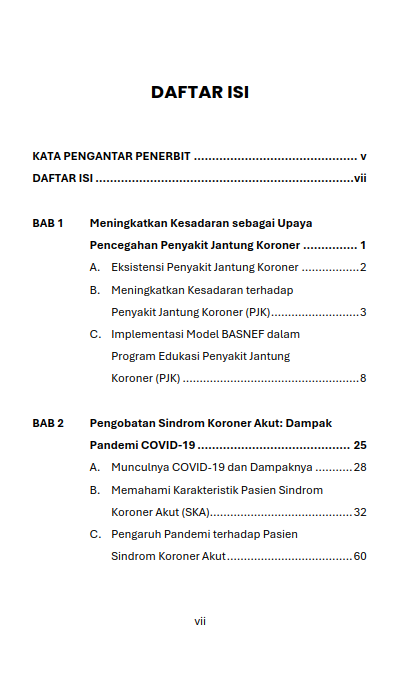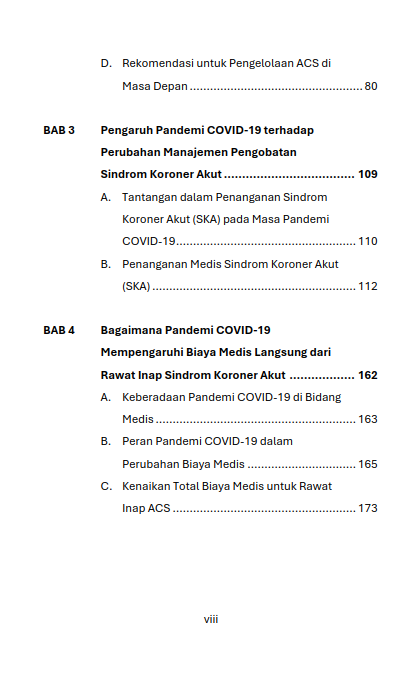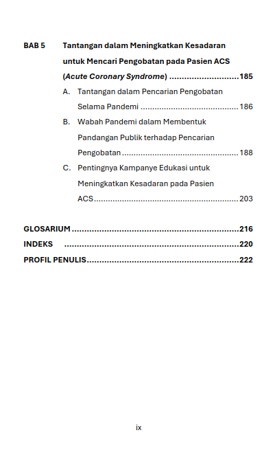 Berikut Daftar Isi Buku Farmasi yang berjudul Buku Acute Coronary Syndrome pada Masa Pandemi: Tantangan Waktu, Biaya, dan Keselamatan Pasien, diantaranya: