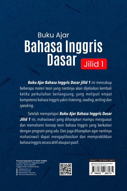 Buku Ajar Bahasa Inggris Dasar Jilid 1 ini diterbitkan oleh Penerbit Buku Pendidikan Deepublish.