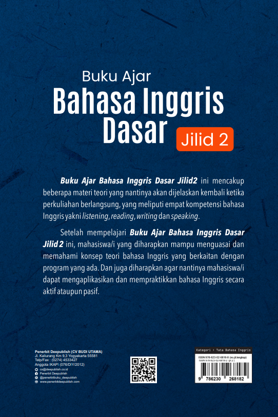 Buku Ajar Bahasa Inggris Dasar Jilid 2 ini diterbitkan oleh Penerbit Buku Pendidikan Deepublish.