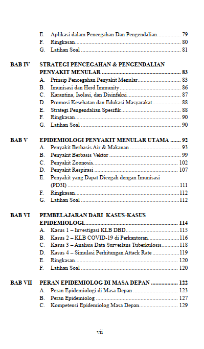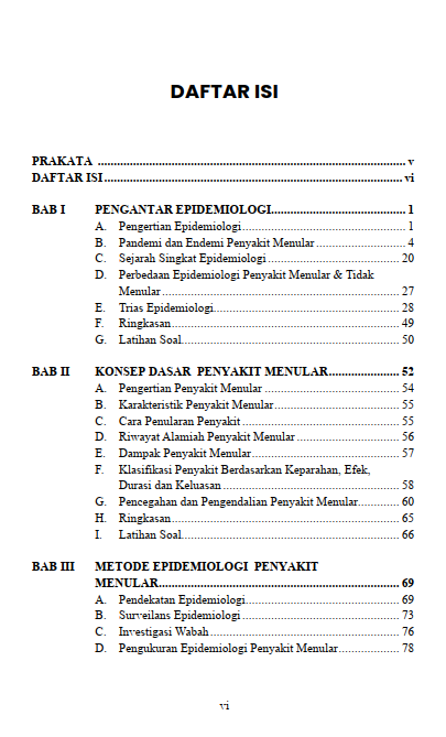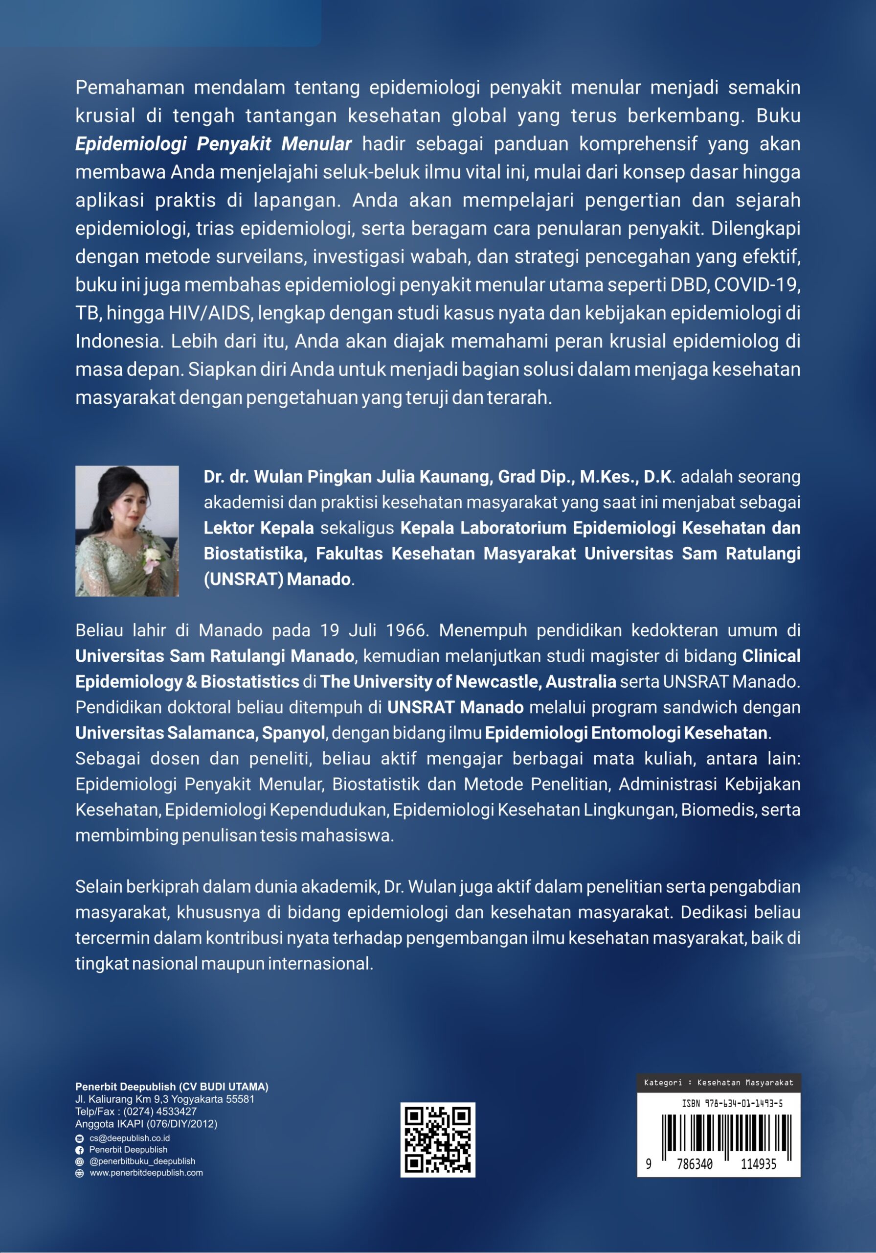 Sinopsis Buku Ajar Epidemiologi Penyakit Menular Buku Ajar Epidemiologi Penyakit Menular Buku Kesehatan yang berjudul Buku Ajar Epidemiologi Penyakit Menular merupakan karya Wulan Pingkan Julia Kaunang. Perkembangan ilmu pengetahuan dan teknologi dalam bidang kesehatan mendorong para tenaga ahli selalu mengadakan riset terhadap bebagai penyakit demi mengatasi kejadian penderitaan dan kematian akibat penyakit yang timbul di masyarakat. Maka berkembang ilmu yang disebut dengan epidemiologi. Epidemiologi berasal dari kata epi (atas), demos (penduduk), dan logos (ilmu). Secara sederhana, epidemiologi adalah ilmu yang memelajari distribusi dan determinan masalah kesehatan dalam populasi, serta penerapannya untuk pengendalian masalah kesehatan. Epidemiologi  pula merupakan cabang ilmu kesehatan untuk menganalisis sifat dan penyebaran berbagai masalah kesehatan dalam suatu penduduk tertentu serta mempelajari sebab timbulnya masalah. Jadi epidemiologi merupakan  studi tentang distribusi dan fakto–faktor yang menentukan keadaan yang berhubungan dengan kesehatan atau kejadian–kejadian pada kelompok penduduk tertentu. Persamaan dari berbagai definisi ialah  tentang kajian di bidang kesehatan, sasaran atau target. Tujuan dari epidemiologi yaitu untuk melakukan Pencegahan maupun penanggulangan masalah yang timbul di masyarakat baik penyakit menular maupun penyakit tidak menular. Di tengah tantangan kesehatan global yang terus berkembang, pemahaman mendalam tentang epidemiologi penyakit menular menjadi semakin krusial. Buku ini hadir sebagai panduan komprehensif yang akan membawa Anda menjelajahi seluk-beluk ilmu vital ini, mulai dari konsep dasar hingga aplikasi praktis di lapangan. Anda akan mempelajari pengertian dan sejarah epidemiologi, trias epidemiologi, serta beragam cara penularan penyakit. Dilengkapi dengan metode surveilans, investigasi wabah, dan strategi pencegahan yang efektif, buku ini juga membahas epidemiologi penyakit menular utama seperti DBD, COVID-19, TB, hingga HIV/AIDS, lengkap dengan studi kasus nyata dan kebijakan epidemiologi di Indonesia. Lebih dari itu, Anda akan diajak memahami peran krusial epidemiolog di masa depan. Siapkan diri Anda untuk menjadi bagian solusi dalam menjaga kesehatan masyarakat dengan pengetahuan yang teruji dan terarah. Buku Ajar Epidemiologi Penyakit Menular sangat cocok menjadi pegangan bagi mahasiswa, dosen, serta praktisi Kesehatan. Dalam memahami prinsip-prinsip epidemiologi dan menerapkannya dalam upaya promotif, preventif, kuratif, maupun rehabilitatif terhadap penyakit menular tentulah buku ajar ini boleh mumpuni. Berikut Daftar Isi Buku Kesehatan yang berjudul Buku Ajar Epidemiologi Penyakit Menular, diantaranya:
