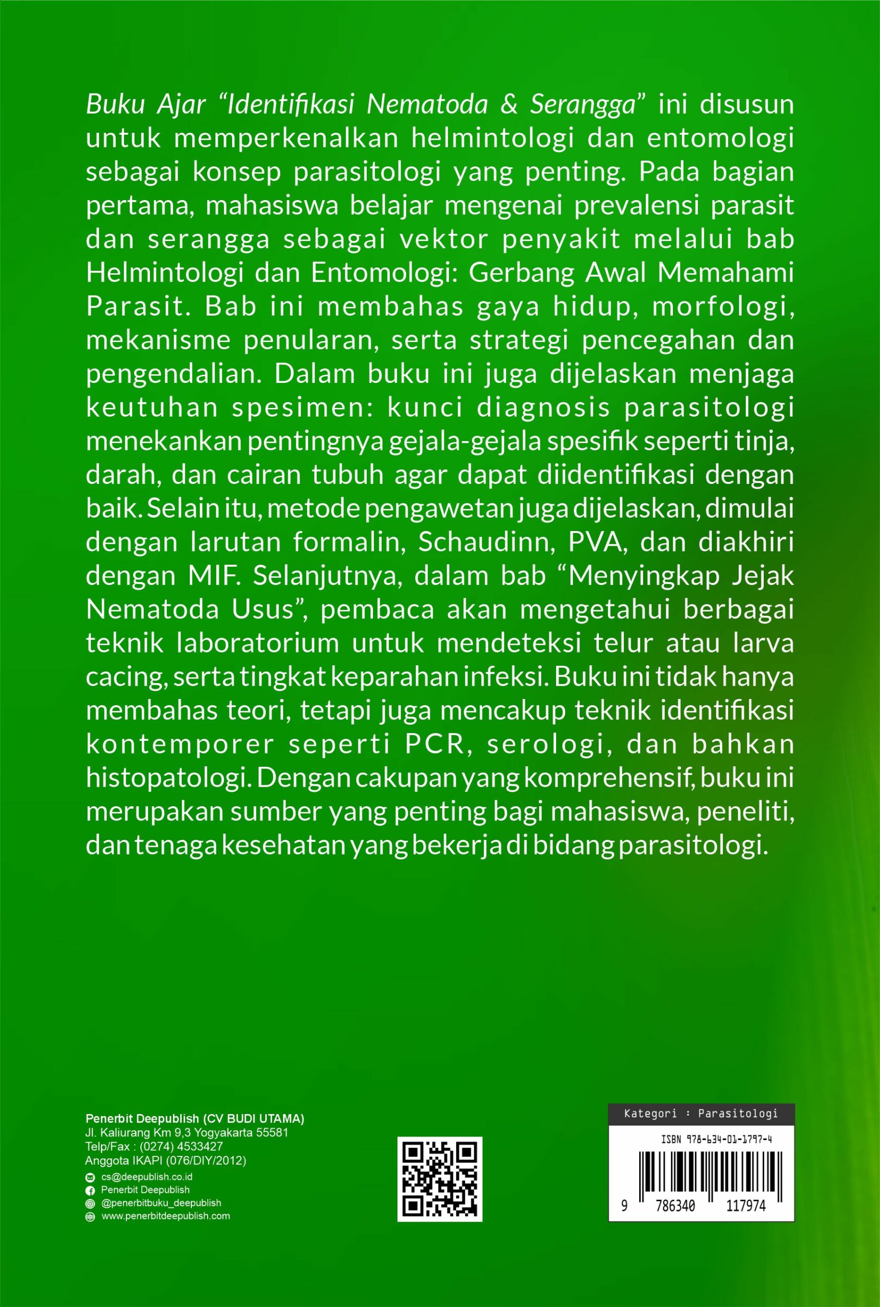 Dalam buku ini juga dijelaskan menjaga keutuhan spesimen: kunci diagnosis parasitologi menekankan pentingnya gejala-gejala spesifik seperti tinja, darah, dan cairan tubuh agar dapat diidentifikasi dengan baik. Selain itu, metode pengawetan juga dijelaskan, dimulai dengan larutan formalin, Schaudinn, PVA, dan diakhiri dengan MIF. Selanjutnya, dalam bab “Menyingkap Jejak Nematoda Usus”, pembaca akan mengetahui berbagai teknik laboratorium untuk mendeteksi telur atau larva cacing, serta tingkat keparahan infeksi. Buku ini tidak hanya membahas teori, tetapi juga mencakup teknik identifikasi kontemporer seperti PCR, serologi, dan bahkan histopatologi. Dengan cakupan yang komprehensif, buku ini merupakan sumber yang penting bagi mahasiswa, peneliti, dan tenaga kesehatan yang bekerja di bidang parasitologi. Buku Ajar “Identifikasi Nematoda & Serangga” sangat cocok menjadi rujukan yang bermanfaat bagi mahasiswa, peneliti, tenaga kesehatan, maupun pihak lain yang menaruh perhatian pada bidang kesehatan masyarakat dan pengendalian penyakit menular.