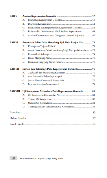 Buku Keperawatan yang berjudul Buku Ajar Keperawatan Gerontik merupakan karya I Gede Putu Darma Suyasa. Perubahan demografi global menandai lahirnya era menua, ketika jumlah penduduk lanjut usia (lanjut usia) meningkat pesat dan menuntut respons serius dari sistem kesehatan. Buku ini disusun sebagai referensi komprehensif bagi mahasiswa, perawat, dan tenaga kesehatan yang ingin memahami dinamika penuaan serta memberikan asuhan yang bermutu, berbasis bukti, dan berfokus pada kualitas hidup lanjut usia. Isi buku dirancang untuk mengalir dari fondasi konseptual ke praktik profesional. Pembaca diajak mengenali teori-teori penuaan, perubahan fisiologis-psikologis, serta kebutuhan sosial dan spiritual yang khas pada lanjut usia. Prinsip promotif dan preventif diuraikan sebagai dasar dalam mengidentifikasi kerentanan, menilai faktor risiko, dan merancang intervensi keperawatan yang tepat.