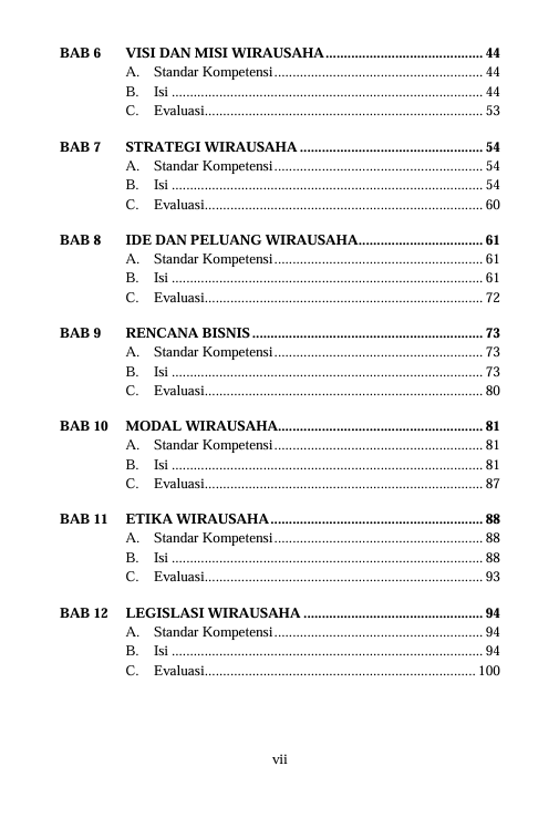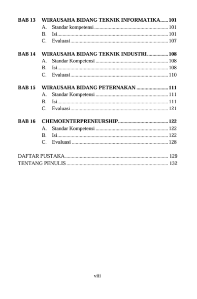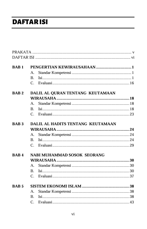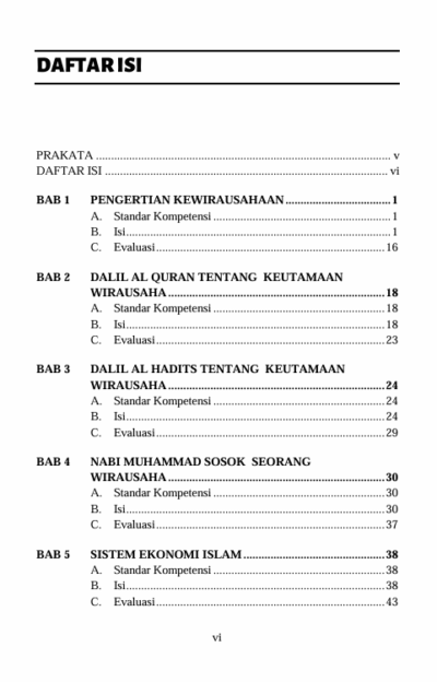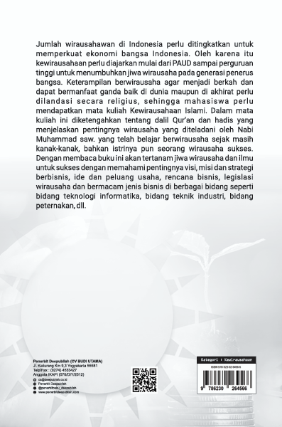 Sinopsis Buku Ajar Kewirausahaan Islami Buku Ajar Kewirausahaan Islami Dalam buku ini dibahas mengenai pengertian kewirausahaan, dasar Al Quran tentang keutamaan kewirausahaan, dasar hadist tentang keutamaan kewirausahaan, serta bagaimana menjadi seorang wirausaha yang setiap langkah kegiatannya dilakukan secara Islami. Jumlah wirausahawan di Indonesia perlu ditingkatkan untuk memperkuat ekonomi bangsa Indonesia. Oleh karena itu kewirausahaan perlu diajarkan mulai dari PAUD sampai perguruan tinggi untuk menumbuhkan jiwa wiruasaha pada generasi penerus bangsa. Keterampilan berwirausaha agar menjadi berkah dan dapat bermanfaat ganda baik di dunia maupun akhirat perlu mendapatkan mata kuliah Kewirausahaan Islami. Dalam mata kuliah ini diketengahkan tentang dalil Qur’an dan hadis yang menjelaskan pentingnya wirausaha yang diteladani oleh Nabi Muhammad SAW yang telah belajar berwirausaha sejak masih kanak-kanak, bahkan istrinya pun seorang wirausaha sukses. Dengan membaca buku ini akan tertanam jiwa wirausaha dan ilmu untuk sukses dengan memahami pentingnya visi, misi dan strategi berbisnis, ide dan peluang usaha, rencana bisnis, legislasi wirausaha dan bermacam jenis bisnis di berbagai bidang seperti bidang teknologi informatika, bidang Teknik industri, bidang peternakan, dll. Berikut Daftar Isi Buku Kewirausahaan yang berjudul Buku Ajar Kewirausahaan Islami, diantaranya:
