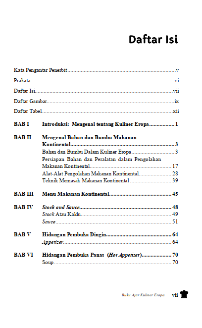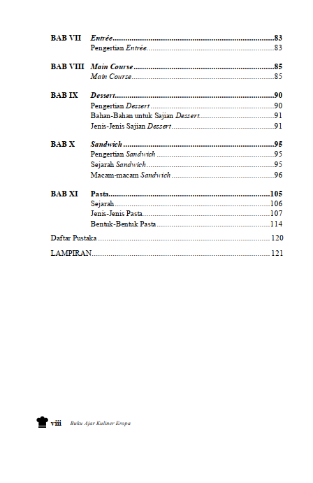 Buku Ajar Kuliner Eropa ini menghadirkan uraian komprehensif bagi mahasiswa tata boga, chef pemula, dan siapa pun yang ingin memahami keunikan cita rasa serta teknik kuliner dari benua Eropa. Disusun secara sistematis, buku ini mengulas berbagai aspek penting mulai dari sejarah kuliner Eropa, karakteristik masakan dari tiap wilayah hingga teknik memasak klasik dan modern yang menjadi fondasi seni kuliner dunia.