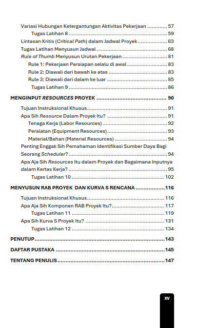 Bagian akhir buku memperluas pemahaman ke pengelolaan sumber daya, penyusunan anggaran, dan kurva S sebagai bagian penting dalam pengendalian proyek. Keseluruhan isi dirangkai untuk menumbuhkan kepekaan terhadap logika penjadwalan dan keterkaitan antarelemen proyek konstruksi. Buku ini menjadi fondasi awal bagi siapa pun yang ingin memahami penjadwalan proyek dengan strategi yang terstruktur dan aplikatif.