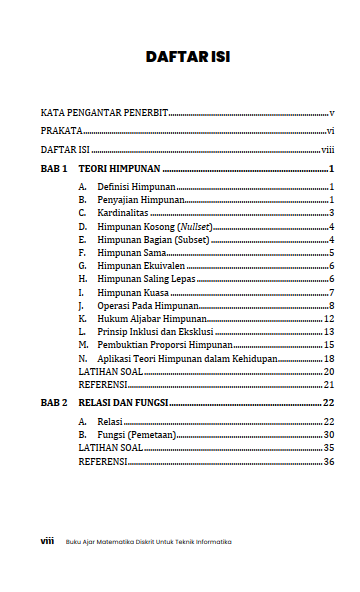 Berikut Daftar Isi Buku Teknik Informatika yang berjudul Buku Ajar Matematika Diskrit untuk Teknik Informatika, diantaranya: