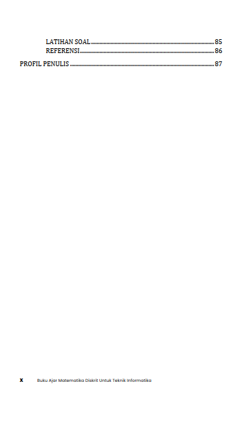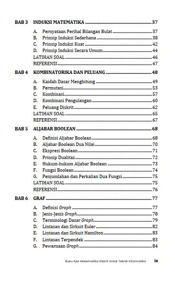 Di bagian akhir, buku ini membawa pembaca ke aljabar Boolean dan graf, dua topik yang sangat dekat dengan dunia teknologi dan sistem digital. Melalui penjelasan yang terstruktur dan aplikatif, buku ini melatih ketelitian dan konsistensi berpikir. Buku ini diharapkan menjadi pegangan yang menemani mahasiswa dalam memahami matematika diskrit sebagai dasar penting di bidang teknik informatika. Buku Ajar Matematika Diskrit untuk Teknik Informatika ini sangat cocok menjadi referensi bagi mahasiswa, peneliti, praktisi bidang teknik yang berguna dalam proses pembelajaran matematika diskrit di perguruan tinggi.