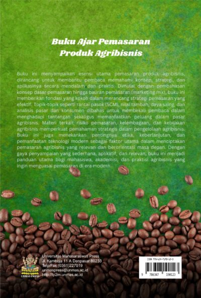 Buku Pertanian ini merupakan karya Luh Putu Kirana Pratiwi dan I Made Tamba. Buku ini menyampaikan esensi utama pemasaran produk agribisnis, ditulis untuk membantu pembaca memahami konsep, strategi, dan aplikasinya secara mendalam dan praktis. Materi yang disajikan mencakup cakupan luas, mulai dari dasar-dasar pemasaran agribisnis, analisis keuangan dan pasar, perilaku konsumen, hingga strategi segmentasi, targeting, dan positioning.