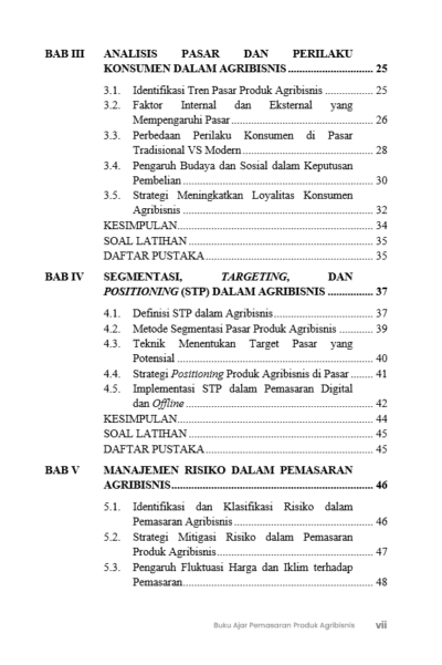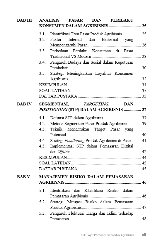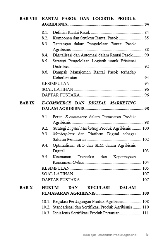 Dimulai dengan pembahasan konsep dasar pemasaran hingga bauran pemasaran (marketing mix), buku ini memberikan fondasi yang kokoh dalam merancang strategi pemasaran yang efektif. Topik-topik seperti rantai pasok (SCM), nilai tambah, daya saing, dan analisis pasar dan konsumen dibahas untuk membekali pembaca dalam menghadapi tantangan sekaligus memanfaatkan peluang dalam pasar agribisnis. Materi terkait risiko pemasaran, kelembagaan, dan kebijakan agribisnis memperkuat pemahaman strategis dalam pengelolaan agribisnis. Buku ini juga menekankan pentingnya etika, keberlanjutan, dan pemanfaatan teknologi modern sebagai faktor utama dalam menciptakan pemasaran agribisnis yang relevan dan berorientasi masa depan. Dengan gaya penyampaian yang sederhana, aplikatif, dan relevan, buku ini menjadi referensi utama bagi mahasiswa, akademisi, dan praktisi agribisnis yang ingin menguasai pemasaran di era modern.