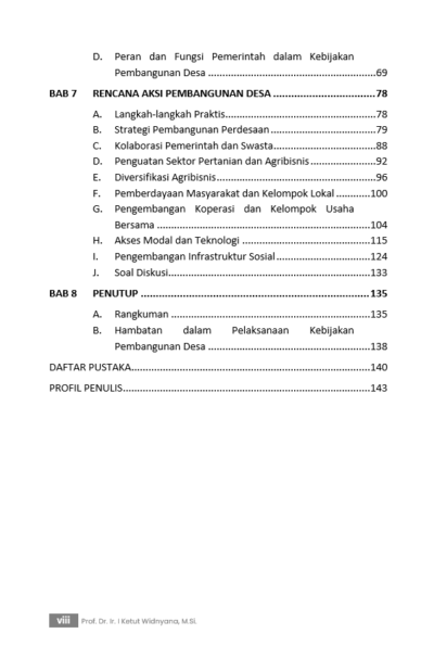 Secara sistematis, buku ini akan membongkar kompleksitas pembangunan perdesaan melalui pendekatan multidimensional. Pembaca akan diajak memahami bagaimana budaya tidak sekadar menjadi objek pelestarian, melainkan subjek aktif dalam proses pembangunan. Dari identifikasi potensi lokal, strategi partisipatif, hingga inovasi berbasis kearifan tradisional, buku ini menawarkan kerangka pikir transformatif yang menempatkan masyarakat sebagai pelaku utama pembangunan. Aspek kebijakan dan peran pemerintah juga menjadi fokus kritis dalam buku ini. Melalui analisis mendalam, akan diurai bagaimana regulasi dan program pemerintah dapat mendukung model pembangunan berbasis budaya. Buku ini tidak sekadar menawarkan kritik, melainkan juga menghadirkan rencana aksi konkret yang dapat diimplementasikan oleh berbagai pemangku kepentingan.