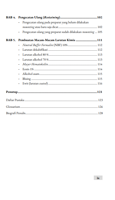 Buku ini juga membahas berbagai situasi yang sering ditemui di lapangan, seperti ketika hasil potongan kurang baik atau warna sediaan tidak sesuai harapan. Dengan penjelasan yang sederhana, pembaca dibekali cara mengatasi masalah tanpa panik dan tetap bekerja secara teliti.