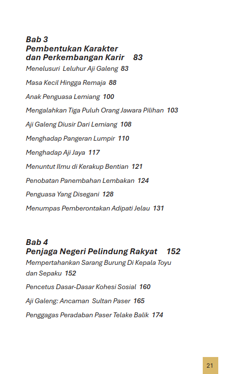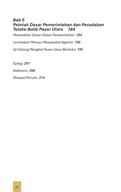 Sinopsis Buku Aji Galeng dari Paser Utara Penjaga Negeri Peletak Peradaban Buku Aji Galeng dari Paser Utara Penjaga Negeri Peletak Peradaban Aji Galeng Dari Paser Utara Penjaga Negeri Peletak Peradaban (1790-1882), seorang tokoh yang berjasa dalam sejarah daerah Kalimantan Timur. Aji Galeng adalah penguasa di Paser Utara, suatu daerah yang berada di antara wilayah Kesultanan Kutai Kertanegara ing Martadipura dan Kesultanan Paser. Dengan terjadinya pemekaran pasca 1999, wilayah ini dipecah menjadi Kabupaten Penajam Paser Utara dan Kabupaten Kutai Kartanegara. Di wilayah inilah terletak Ibu Kota Baru Negara (IKN) yang diumumkan Presiden Jokowi di depan anggota DPR-RI pada 26 Agustus 2019. Kini dengan Pembangunan Ibu Kota Negara baru Republik Indonesia bernama “Nusantara” dapat dicatat sebagai membangun peradaban baru. Ibarat pepatah “dari asal kembali ke asal” ketika sejarah Indonesia pertama kali bermula dari Kerajaan Kutai di Kalimantan Timur, kini sejarah ibu kota baru Nusantara Kembali berawal dari Kalimantan Timur. Berikut Daftar Isi Buku Sejarah yang berjudul Buku Aji Galeng dari Paser Utara Penjaga Negeri Peletak Peradaban, diantaranya: