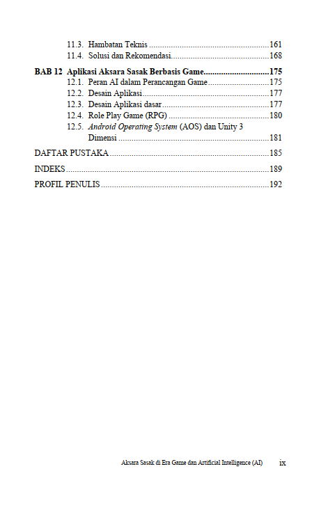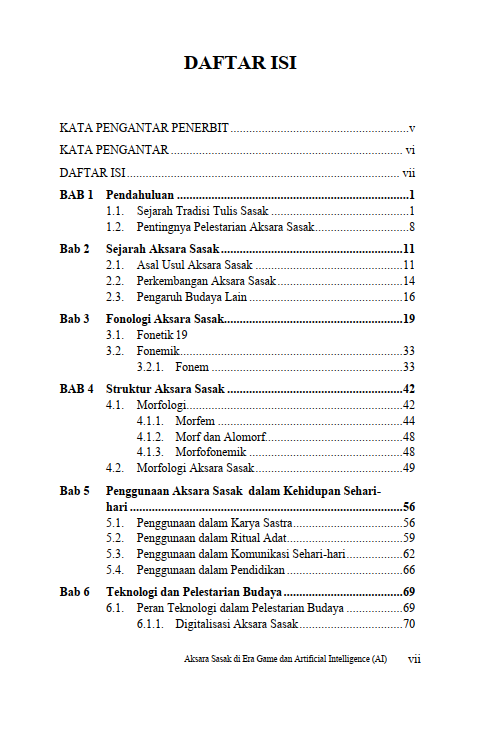 Berikut Daftar Isi Buku Ilmu Komputer yang berjudul Buku Aksara Sasak di Era Game Dan Artificial Intelligence (AI), diantaranya: