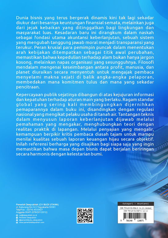 Buku Akuntansi Keberlanjutan: Konsep, Teori, Standar Global, dan Regulasi Indonesia Volume 1 diterbitkan oleh Penerbit Buku Pendidikan Deepublish.