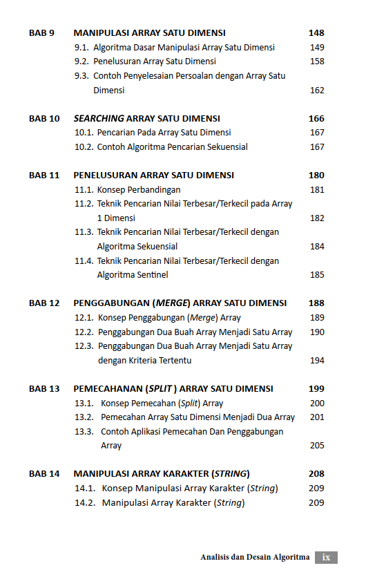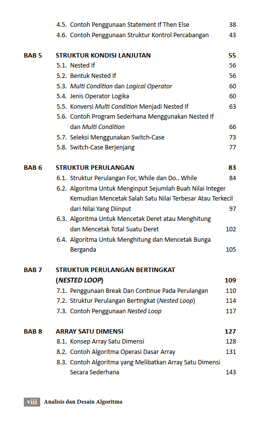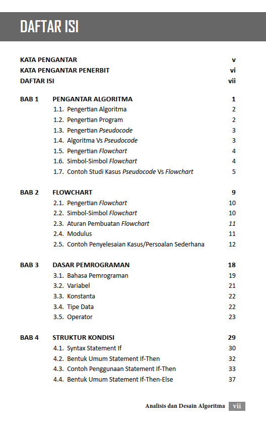 Sinopsis Buku Analisis dan Desain Algoritma Buku Analisis dan Desain Algoritma Buku Ilmu Komputer yang berjudul Buku Analisis dan Desain Algoritma merupakan karya Achmad Solichin, Ita Novita, Atik Ariesta dan Moch. Sjukani. Algoritma adalah langkah-langkah yang diambil dalam menyelesaikan suatu pekerjaan. Suatu pekerjaan dapat diselesaikan dalam satu langkah, dua langkah, atau banyak langkah. Langkah-langkah harus tersusun secara logis agar pekerjaan dapat diselesaikan dengan benar. Di dunia komputer dan pemrograman, manusia bertugas untuk memberikan perintah kepada komputer, langkah per langkah yang akan dilaksanakan oleh komputer untuk menyelesaikan pekerjaan tersebut. Algoritma merupakan gabungan seni dan teknik. Seni, karena algoritma penuh dengan kreativitas dan imajinasi yang jenius. Teknik, karena algoritma diterapkan di komputer yang penuh dengan tool dan metodologi. Ketika membuat algoritma, perhatikan apakah perintah yang akan diberikan nantinya bisa dipahami oleh komputer atau tidak. Jika tidak, maka harus mencari cara agar algoritma bisa dipahami oleh komputer. Komputer hanya mengerti bahasanya sendiri yaitu bahasa mesin. Sebuah pseudocode tidak dipahami oleh komputer oleh karena itu diperlukan sebuah bahasa pemrograman agar dapat dimengerti oleh komputer. Program adalah algoritma yang ditulis dalam suatu bahasa yang dikenal oleh komputer yang disebut bahasa pemrograman (programming language). Supaya lebih paham baca terlebih dahulu buku ilmu komputer terbaik ini. Berikut Daftar Isi Buku Ilmu Komputer yang berjudul Buku Analisis dan Desain Algoritma, diantaranya: