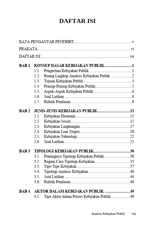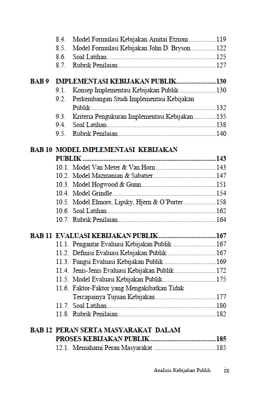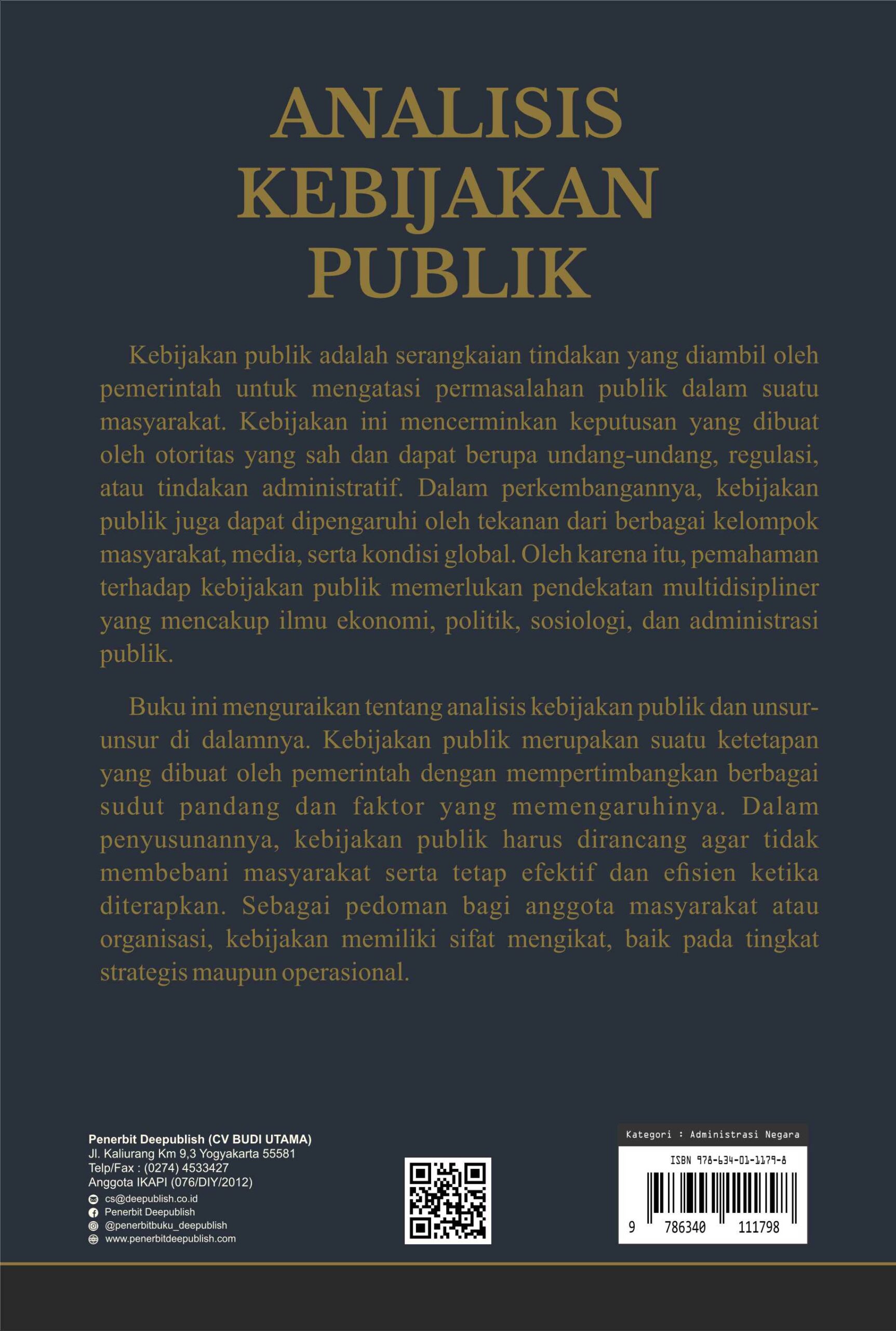 Sinopsis Buku Analisis Kebijakan Publik Buku Analisis Kebijakan Publik Buku Administrasi Negara yang berjudul Buku Analisis Kebijakan Publik merupakan karya Amrin. Kebijakan publik adalah serangkaian tindakan yang diambil oleh pemerintah untuk mengatasi permasalahan publik dalam suatu masyarakat. Kebijakan ini mencerminkan keputusan yang dibuat oleh otoritas yang sah dan dapat berupa undang-undang, regulasi, atau tindakan administratif. Dalam perkembangannya, kebijakan publik juga dapat dipengaruhi oleh tekanan dari berbagai kelompok masyarakat, media, serta kondisi global. Analisis kebijakan publik merupakan studi yang bertujuan untuk memahami dan mengevaluasi berbagai aspek dalam perumusan dan implementasi kebijakan yang dapat membantu dalam memahami bagaimana suatu kebijakan dibuat, siapa yang terlibat, serta dampak yang ditimbulkannya terhadap masyarakat. Setiap kebijakan berfungsi sebagai solusi terhadap persoalan yang dihadapi masyarakat. Kebijakan dirancang untuk menyelesaikan masalah tanpa menciptakan permasalahan baru. Dalam perumusan kebijakan publik, terdapat berbagai alternatif pilihan yang dipertimbangkan agar kebijakan yang diambil merupakan opsi terbaik dibandingkan alternatif lainnya. Semakin banyak alternatif yang tersedia, semakin baik kualitas kebijakan yang dihasilkan. Hal ini memungkinkan evaluasi yang lebih komprehensif terhadap implementasi kebijakan serta indikator keberhasilannya. Sebagai pedoman bagi anggota masyarakat atau organisasi, kebijakan memiliki sifat mengikat, baik pada tingkat strategis maupun operasional. Kebijakan dibuat oleh otoritas politik yang memiliki mandat dari masyarakat, biasanya melalui pemilihan umum, untuk bertindak atas nama publik. Kebijakan publik disusun dan diorganisasikan untuk mencapai tujuan tertentu, terutama dalam mengatur kehidupan bermasyarakat. Dari sudut pandang efektivitas, kebijakan publik berfungsi sebagai instrumen untuk mewujudkan berbagai nilai publik yang menjadi perhatian pemerintah. Buku ini menguraikan tentang analisis kebijakan publik dan unsur-unsur di dalamnya. Kebijakan publik merupakan suatu ketetapan yang dibuat oleh pemerintah dengan mempertimbangkan berbagai sudut pandang dan faktor yang memengaruhinya. Dalam penyusunannya, kebijakan publik harus dirancang agar tidak membebani masyarakat serta tetap efektif dan efisien ketika diterapkan. Sebagai pedoman bagi anggota masyarakat atau organisasi, kebijakan memiliki sifat mengikat, baik pada tingkat strategis maupun operasional. Buku Analisis Kebijakan Publik sangat cocok bagi para peneliti, mahasiswa, dan praktisi akademisi yang ingin memahami kebijakan publik melalui pendekatan multidisipliner yang mencakup ilmu ekonomi, politik, sosiologi, dan administrasi publik. Berikut Daftar Isi Buku Administrasi Negara yang berjudul Buku Analisis Kebijakan Publik, diantaranya: